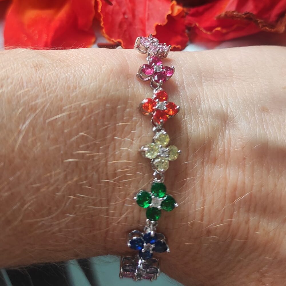 Pulseira flores coloridas, inspirada na  alta joalheria. No banho de ródio com fecho de jóia.