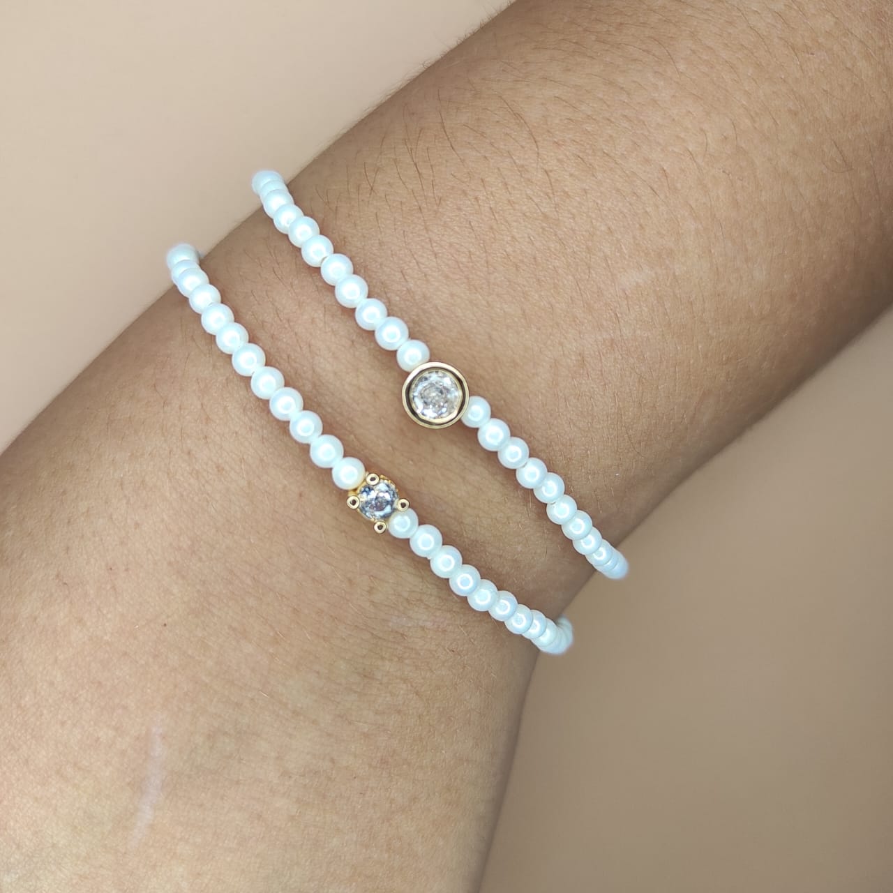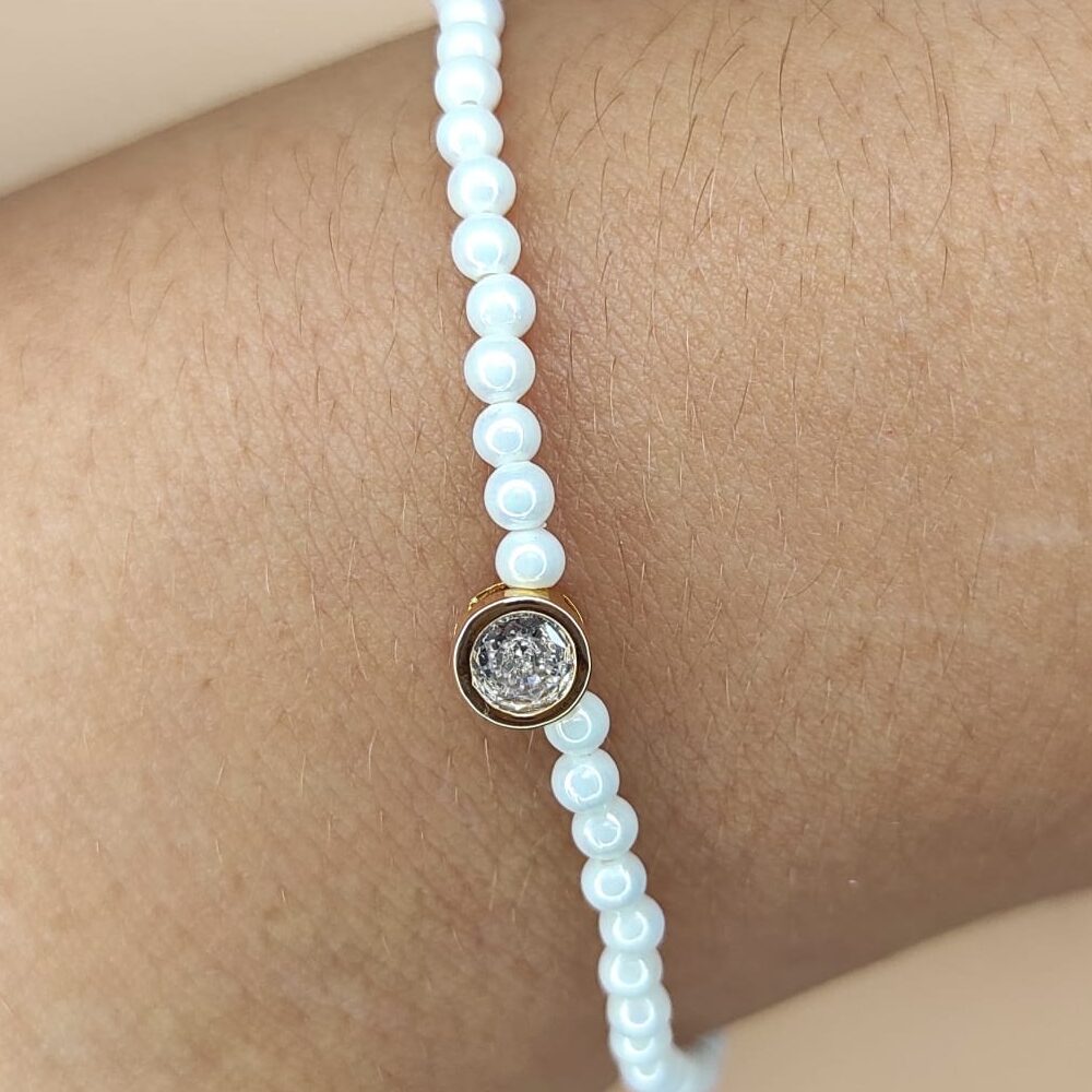 Pulseira com mini pérolas Shell e ponto de luz redondo com cravação inglesa, e metais banhados a ouro 18k.